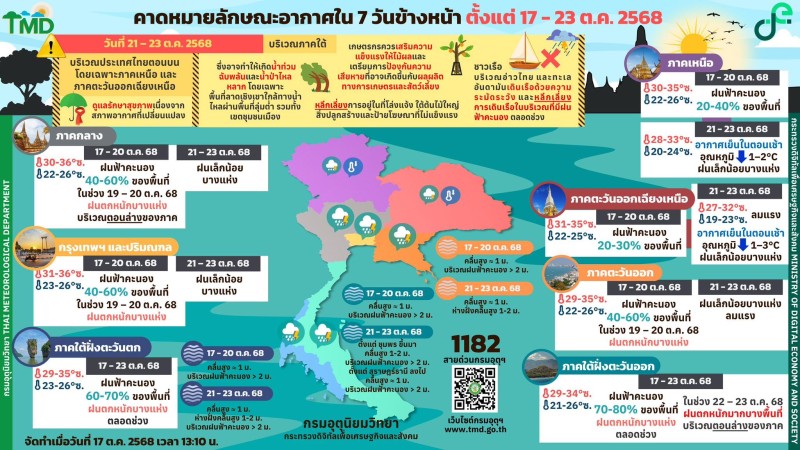 เมื่อวันที่ 17 ตุลาคม 2568 ศูนย์ประชาสัมพันธ์ กรมอุตุนิยมวิทยา คาดหมายลักษณะอากาศ 7 วันข้างหน้า (17 - 23 ตุลาคม 2568) โดยระบุว่า