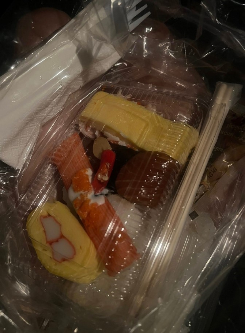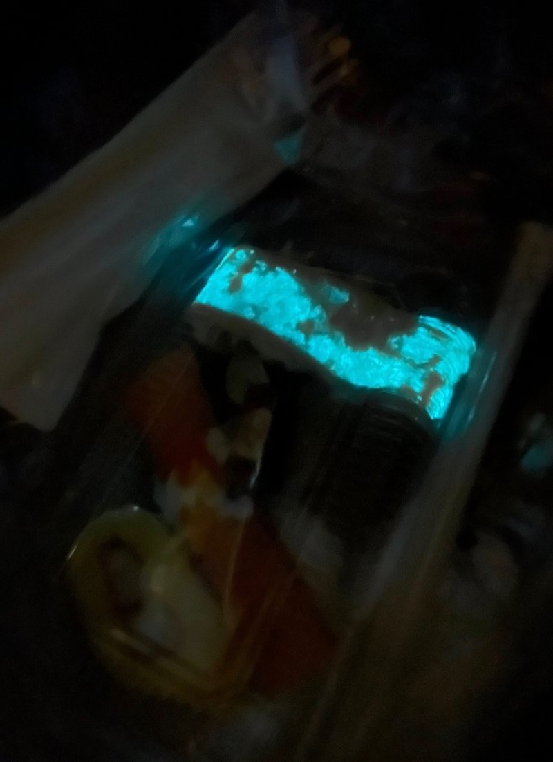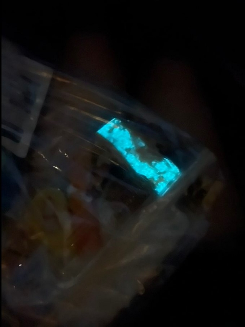ซื้อซูชิแบรนด์นึงมา กำลังจะลงรถปิดไฟ แล้วเห็นว่ามันมีแสงสีฟ้าเรืองขึ้นมา สงสัยว่าแสงสีฟ้ามันคืออะไรคะ ขึ้นแสงสีฟ้าเฉพาะบริเวณซูชิชิ้นนั้นชิ้นเดียว ซึ่งชิ้นนั้นเป็นชิ้นที่สั่งพนักงานทำใหม่ เนื่องจากในถาดหมดแล้ว