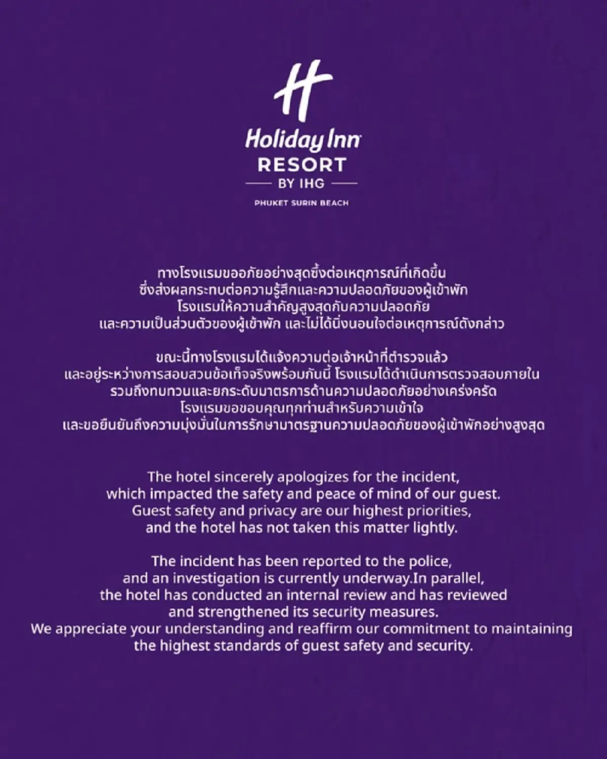 ในแถลงการณ์ยังระบุเพิ่มเติมว่า ขณะนี้โรงแรมได้เข้าแจ้งความต่อเจ้าหน้าที่ตำรวจแล้ว และอยู่ระหว่างการสอบสวนข้อเท็จจริงควบคู่ไปกับการตรวจสอบภายในองค์กร รวมถึงการทบทวนและยกระดับมาตรการรักษาความปลอดภัยให้มีความรัดกุมมากยิ่งขึ้น พร้อมขอขอบคุณผู้เข้าพักและสาธารณชนที่ให้ความเข้าใจ และยืนยันถึงความมุ่งมั่นในการรักษามาตรฐานด้านความปลอดภัยในระดับสูงสุด
